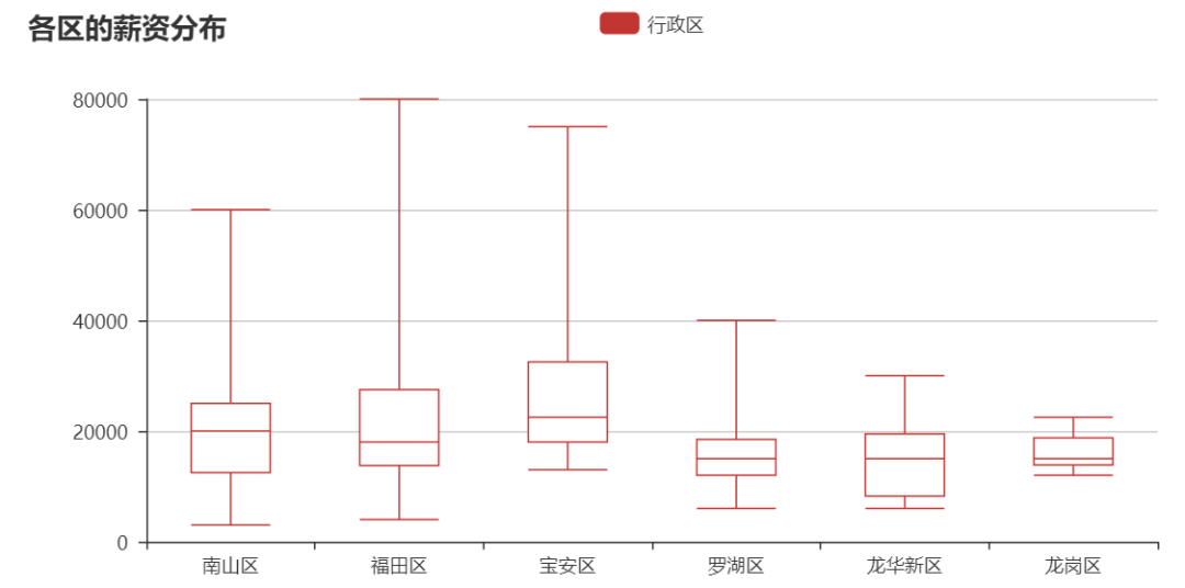 从薪资分布区域来看 , 各区平均工资基本在15k-22k之间,市场行情也比较统一,平均工资差距都不会太大。