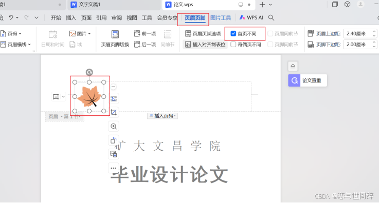 - 打开“页眉/页脚设置”对话框,勾选“首页不同”复选框,在“页眉页脚”选项卡中单击“图片”按钮