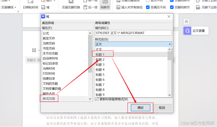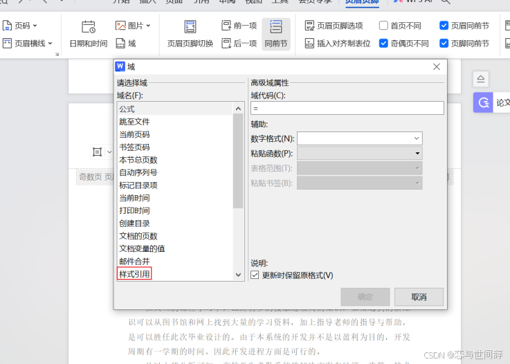 - 在“页眉页脚”选项卡中单击“同前节”按钮,在“页眉页脚”选项卡中单击“域”按钮