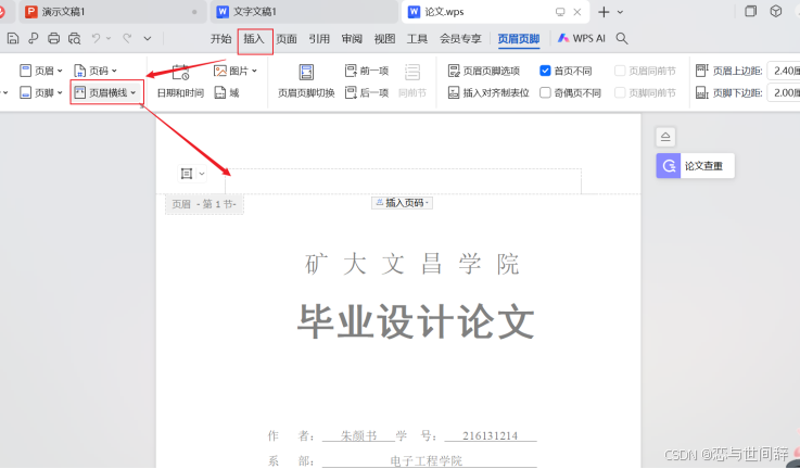 - 在“插入”选项卡中单击“页眉页脚”按钮,将光标插入页眉中