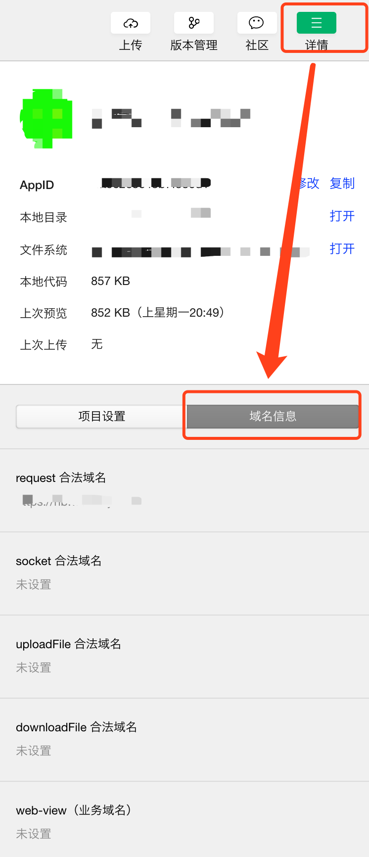 解决:在小程序开发者工具中点击“详情”后点击“域名信息”,就会自动刷新