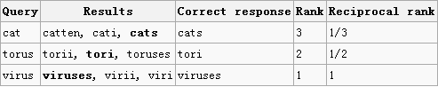 可计算这个系统的MRR值为:(1/3 + 1/2 + 1)/3 = 11/18=0.61。