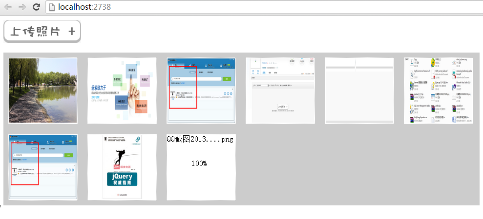 <script type="text/javascript"> $(function () { $("#file_upload").uploadify({ queueID: "1", swf: '/Scripts/uploadify/uploadify.swf', uploader: '/Home/Upload', // 上传文件,后台上传方法 buttonImage: "/images/xiangcebiaoqian_anniu.gif", // 按钮图片地址 fileSizeLimit: '100000000KB', // 最大允许文件上传大小,这里是 10M fileTypeDesc: 'Image Files', fileTypeExts: '*.gif; *.jpg; *.png; *.jpeg', auto: true, // 自动上传 uploadLimit: 20, // 允许文件上传个数 queueSizeLimit: 5, // 允许同时文件上传个数 width: 159, // 上传按钮的宽度 height: 47, // 上传按钮的高度 onSelect: function (file) { // 选择文件的事件 var name = file.name; if (name.length >= 10) { var index = name.lastIndexOf("."); name = name.substr(0, 8) + "...." + name.substr(index + 1); } var html = '<div id="div_id_' + file.id + '" class="uploading"><div id="div_title_' + file.id + '" class="uploading_file_name">' + name + '<div><div id="div_uploading_' + file.id + '" class="uploading_schedule">0%</div></div>'; $("#div_img_list").append(html); }, onUploadProgress: function (file, bytesUploaded, bytesTotal, totalBytesUploaded, totalBytesTotal) { // 上传文件的进度事件 var v = Math.round(bytesUploaded / bytesTotal * 100); $('#div_uploading_' + file.id).html(v + "%"); }, onUploadSuccess: function (file, data, response) { // 上传文件成功之后的事件 $("#div_title_" + file.id).remove(); $("#div_uploading_" + file.id).remove(); var html = '<img alt="" src="' + data + '" />'; html += "<a href=\"javascript:\" onclick=\"DeleteFile('" + file.id + "');\">X</a>"; $("#div_id_" + file.id).html(html); } }); }); // 移除图片 function DeleteFile(id) { $("#div_id_" + id).remove(); } </script>