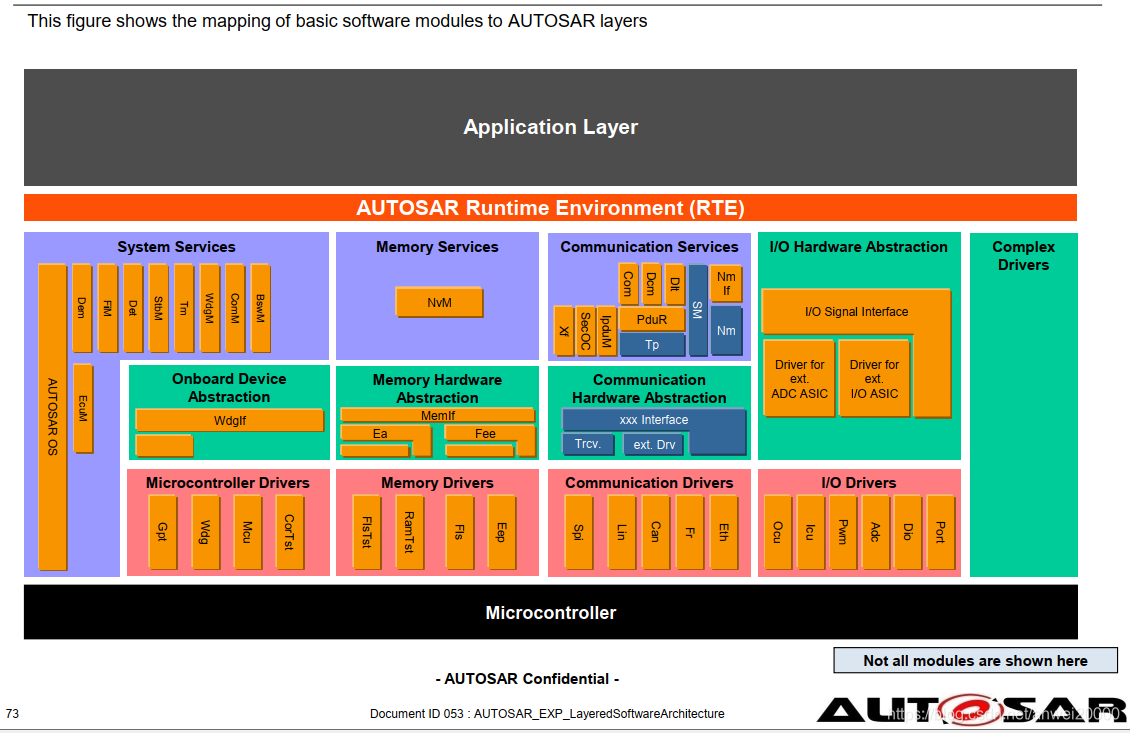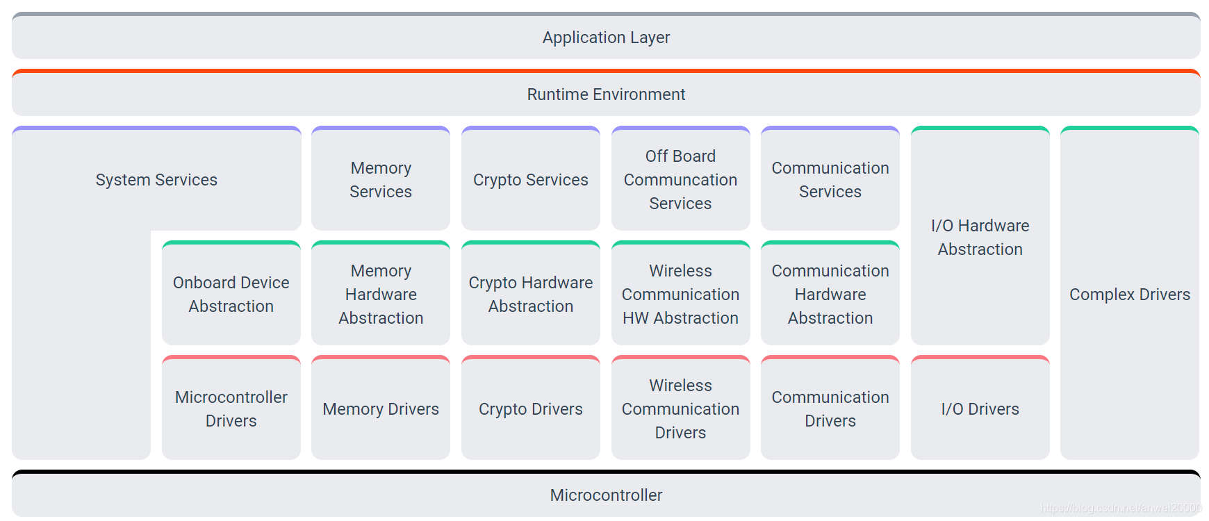 分为服务层、 ECU 抽象层、微控制器抽象层和运行时环境,运行时环境使应用软件从底层软件和硬件平台相互独立。