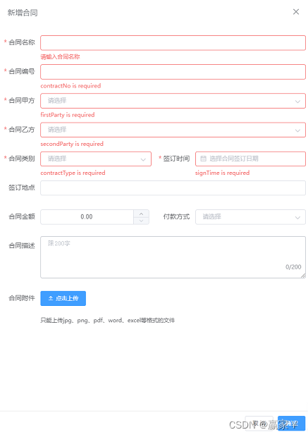 el-form表单校验出现英文 el-form表单校验,已经配置rules,当我们手动删除输入框的值,提示firstParty is required英文提示,配置的明明是中文:请选择合同甲方,为何会有英文提示?让我们一起来看代码~配置校验规则注意点:1. el-from-item这个组件标签绑定prop属性,校验规则才能生效(此处prop的值是我们绑定在el-from标签上对象的key);2. 观察代码,我们已经在rules配置自定义校验规则,所以要将el-form-item标签内部required去掉(这时再查看页面,发现