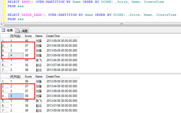 下面的示例展示了Rank()与Dense_Rank()的区别。主要区别就是Rank返回的排名数字可能是非连续的,因为同样大小的排名数字会占位,而Dense_Rank返回的排名数字一定是连续的,因为同样大小的排名数字不会占位。