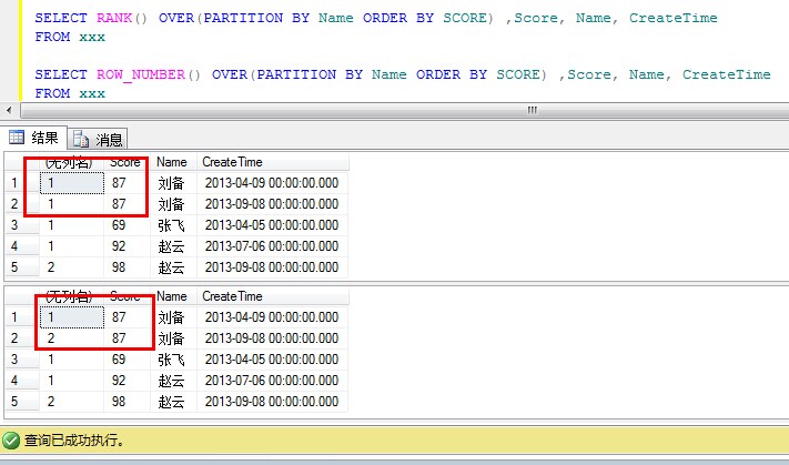SELECT DENSE_RANK() OVER(PARTITION BY Name ORDER BY SCORE) ,Score, Name, CreateTime FROM xxx