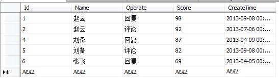 CREATE TABLE [dbo].[xxx]( [Id] [int] NULL, [Name] [nvarchar](50) NULL, [Operate] [nvarchar](50) NULL, [Score] [int] NULL, [CreateTime] [datetime] NULL ) ON [PRIMARY]