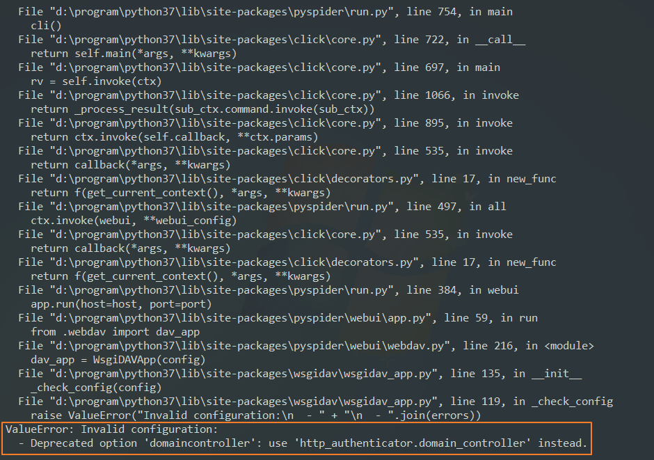 最后定位在了wsgidav3.x问题,pyspider会默认安装wsgdav3.x,解决办法是先把3.x卸载,再装2.x ( pip install wsgidav 会默认安装 2.x),为了保险起见,使用pip安装时加上具体版本号