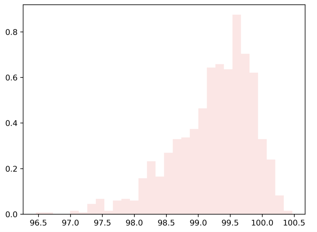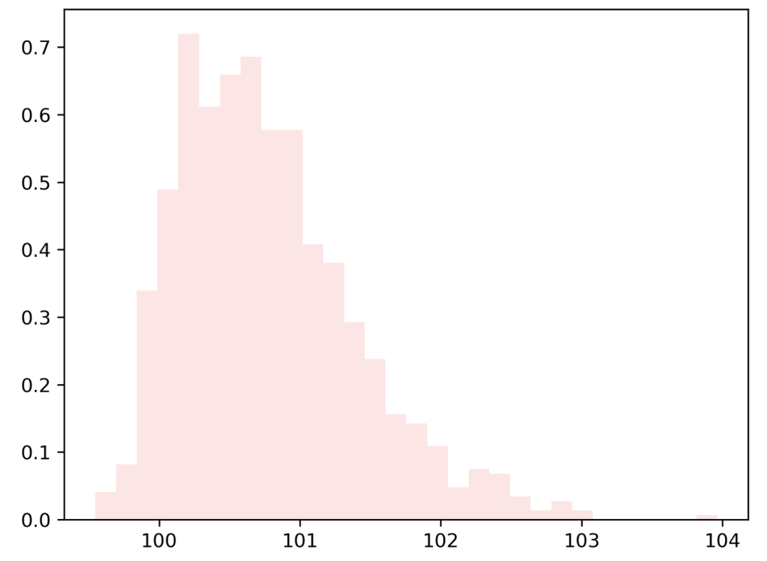 plt.hist(random,30,density=True, color = ‘red’, alpha=0.1)
