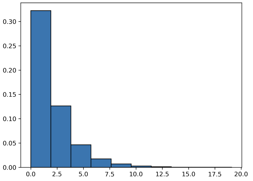 x = expon.rvs(scale=2, size=10000) # 2 calls