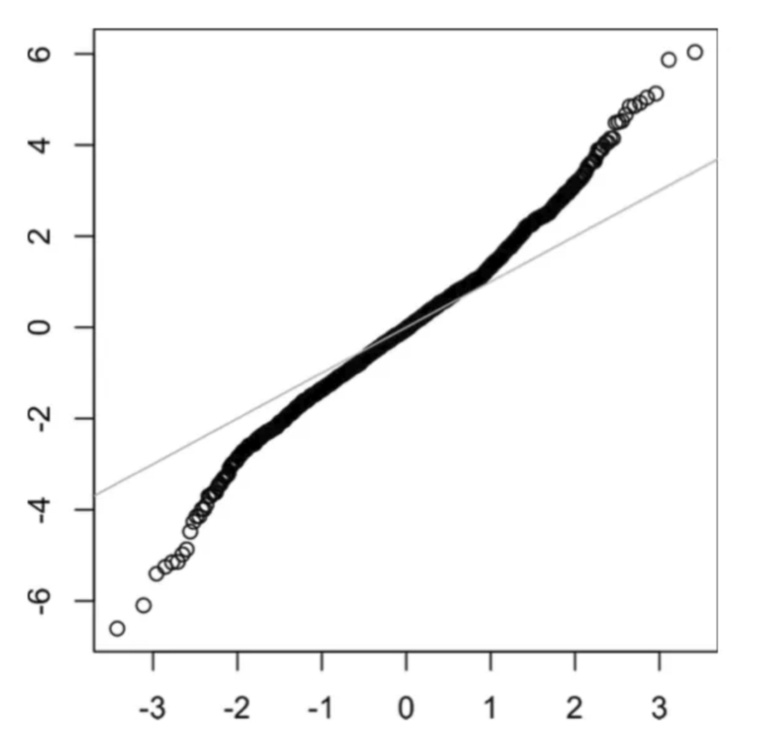 尾巴是分布的长而窄的部分,离群值就位于其中。当一侧尾巴不同于另一侧时,就称为偏斜。下图是长尾分布的 QQ 图。