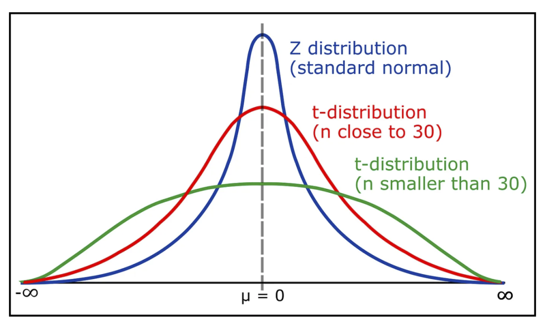 t 分布和 z 分布。来源:https://www.geeksforgeeks.org/students-t-distribution-in-statistics/