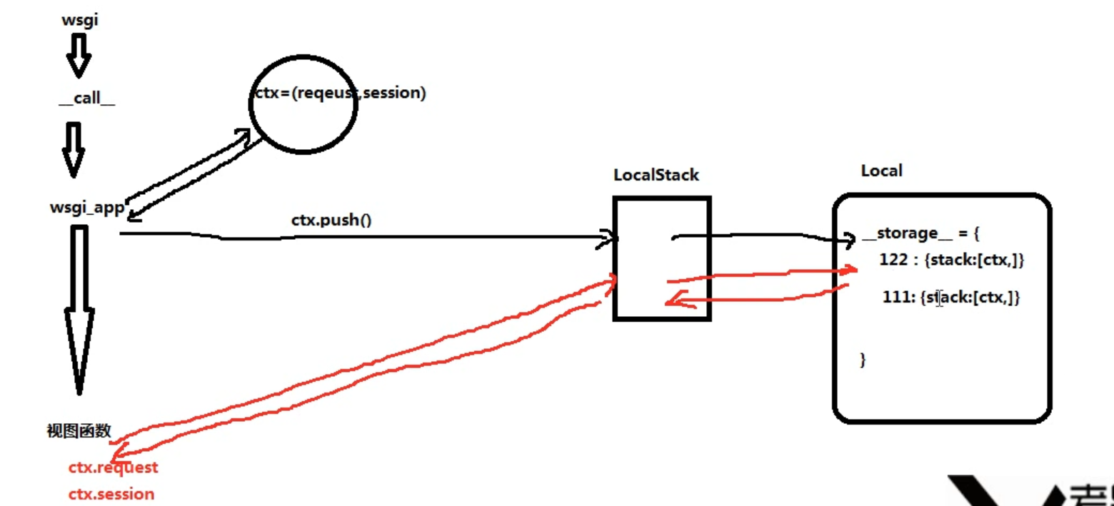 # by luffycity.com import functools try: from greenlet import getcurrent as get_ident except: from threading import get_ident class Local(object): __slots__ = ('__storage__', '__ident_func__') def __init__(self): # __storage__ = {1231:{'stack':[]}} object.__setattr__(self, '__storage__', {}) object.__setattr__(self, '__ident_func__', get_ident) def __getattr__(self, name): try: return self.__storage__[self.__ident_func__()][name] except KeyError: raise AttributeError(name) def __setattr__(self, name, value): # name=stack # value=[] ident = self.__ident_func__() storage = self.__storage__ try: storage[ident][name] = value except KeyError: storage[ident] = {name: value} def __delattr__(self, name): try: del self.__storage__[self.__ident_func__()][name] except KeyError: raise AttributeError(name) """ __storage__ = { 12312: {stack:[ctx(session/request) ,]} } """ # obj = Local() # obj.stack = [] # obj.stack.append('佳俊') # obj.stack.append('咸鱼') # print(obj.stack) # print(obj.stack.pop()) # print(obj.stack) class LocalStack(object): def __init__(self): self._local = Local() def push(self,value): rv = getattr(self._local, 'stack', None) # self._local.stack =>local.getattr if rv is None: self._local.stack = rv = [] # self._local.stack =>local.setattr rv.append(value) # self._local.stack.append(666) return rv def pop(self): """Removes the topmost item from the stack, will return the old value or `None` if the stack was already empty. """ stack = getattr(self._local, 'stack', None) if stack is None: return None elif len(stack) == 1: return stack[-1] else: return stack.pop() def top(self): try: return self._local.stack[-1] except (AttributeError, IndexError): return None class RequestContext(object): def __init__(self): self.request = "xx" self.session = 'oo' _request_ctx_stack = LocalStack() _request_ctx_stack.push(RequestContext()) def _lookup_req_object(arg): ctx = _request_ctx_stack.top() return getattr(ctx,arg) # ctx.request / ctx.session request = functools.partial(_lookup_req_object,'request') session = functools.partial(_lookup_req_object,'session') print(request()) print(session())