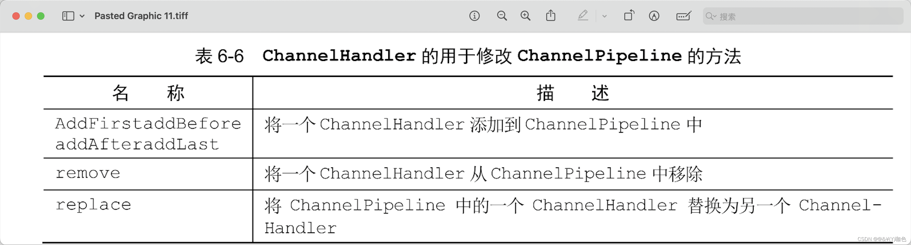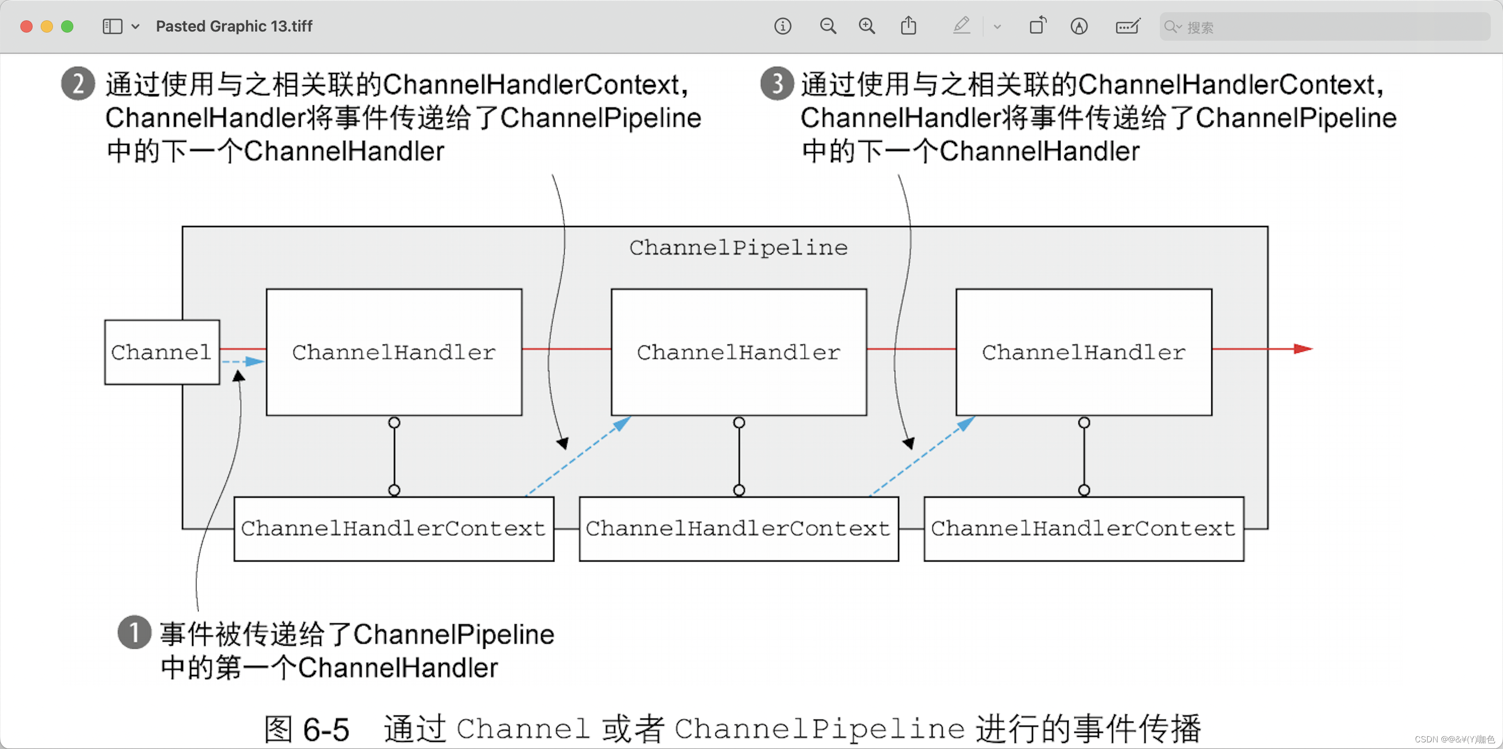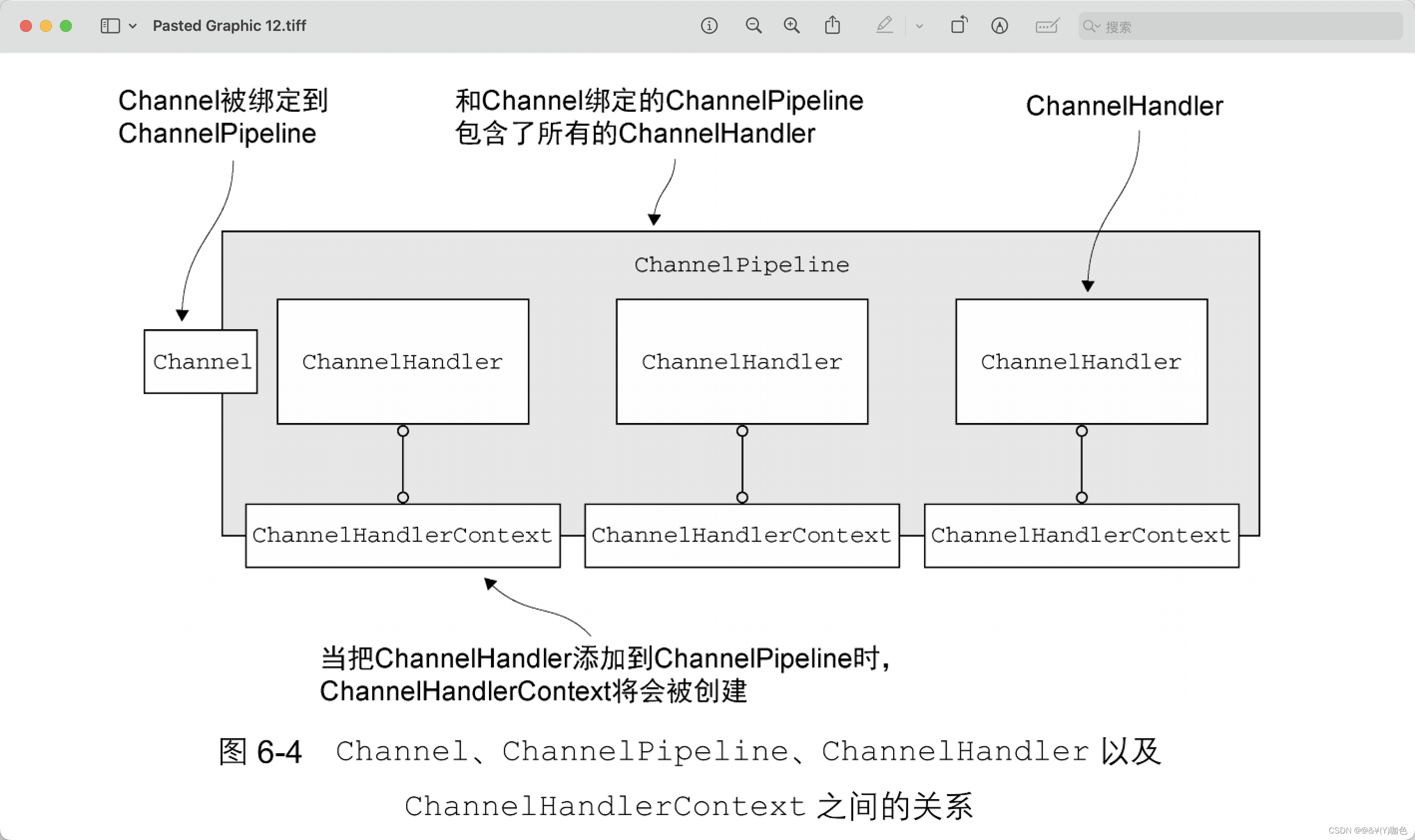 3. 当ChannelHandler被添加到ChannelPipeline时,它将会被分配一个ChannelHandlerContext,其代表了Channelhandler和ChannelPineline之间的约定