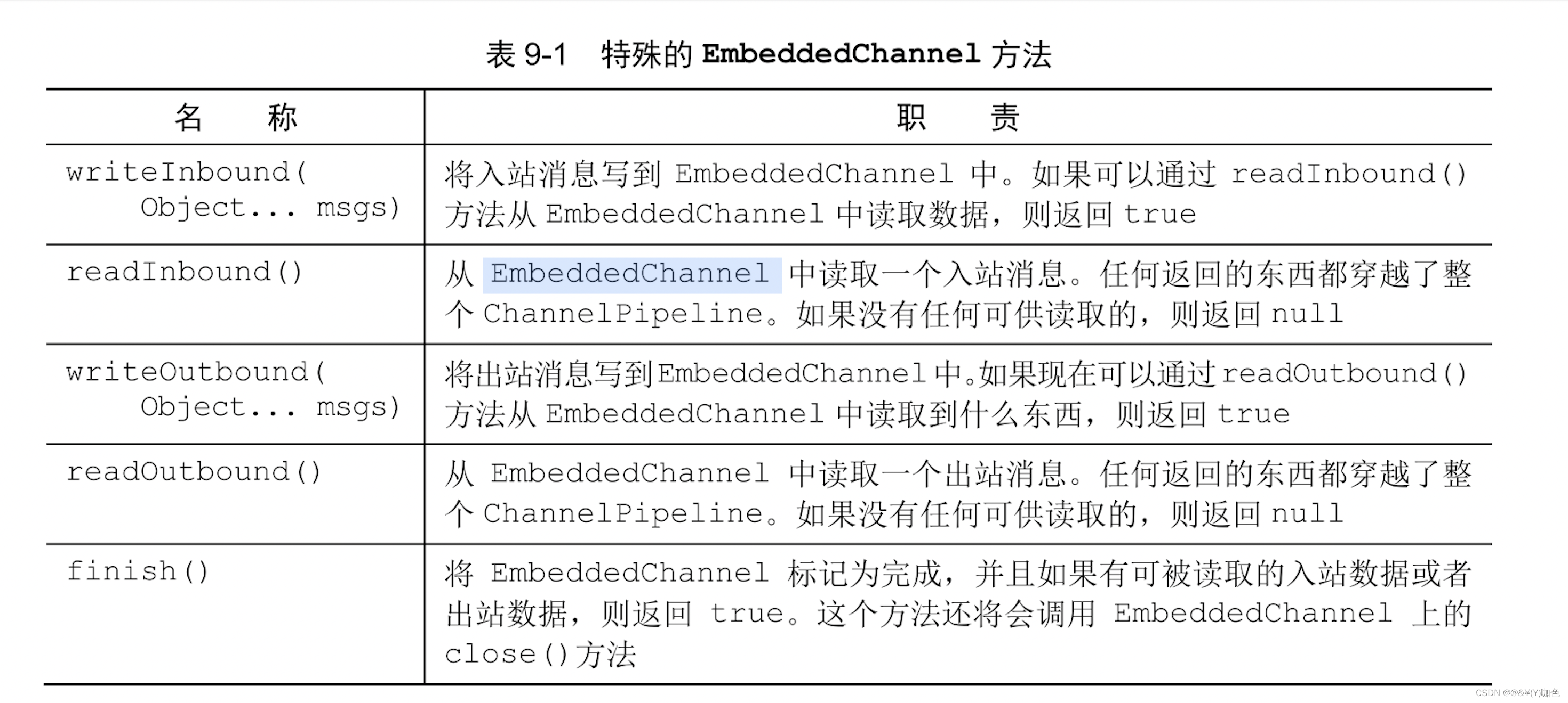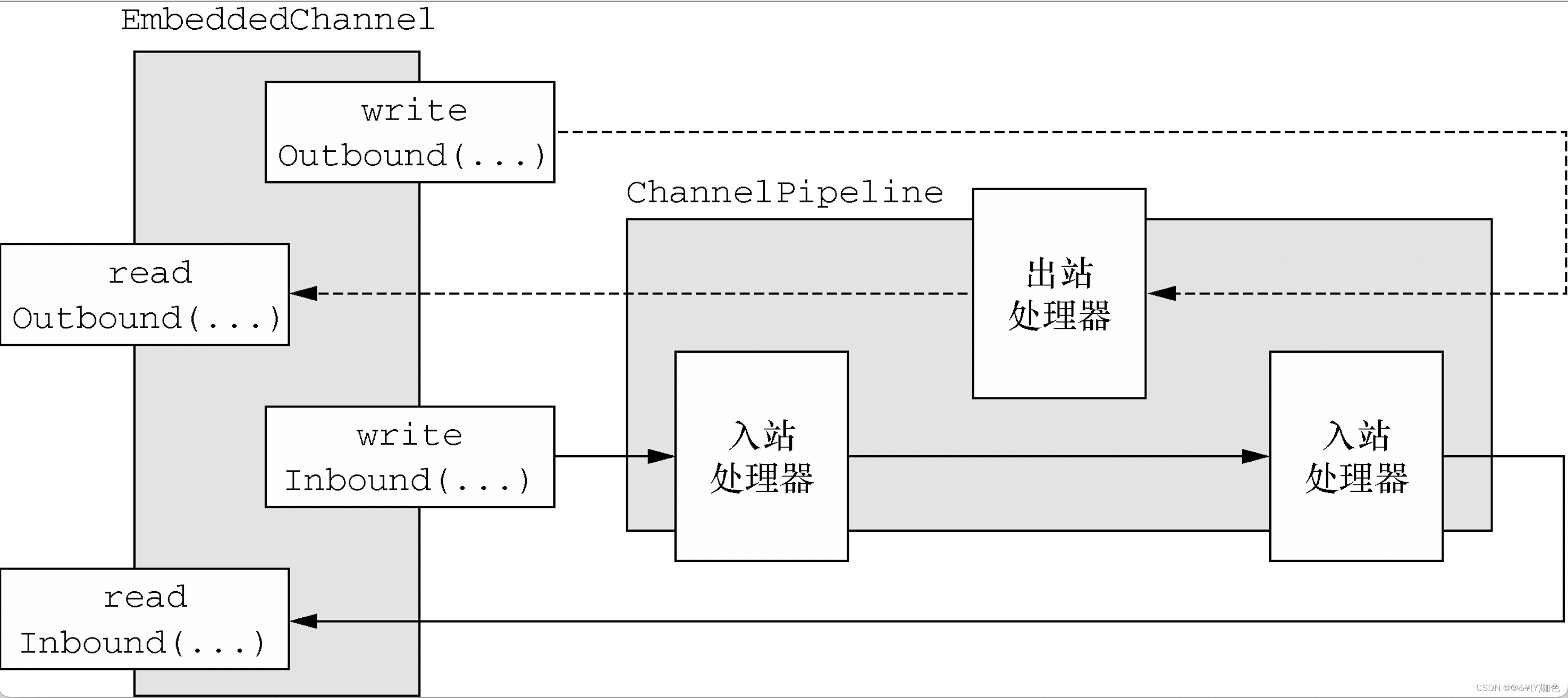 EmbeddedChannel: Netty专门为改进针对ChannelHandler的单元测试而提供的,同时可以try/catch(如果未重写exceptionCaught方法对前提下),方便对异常测试