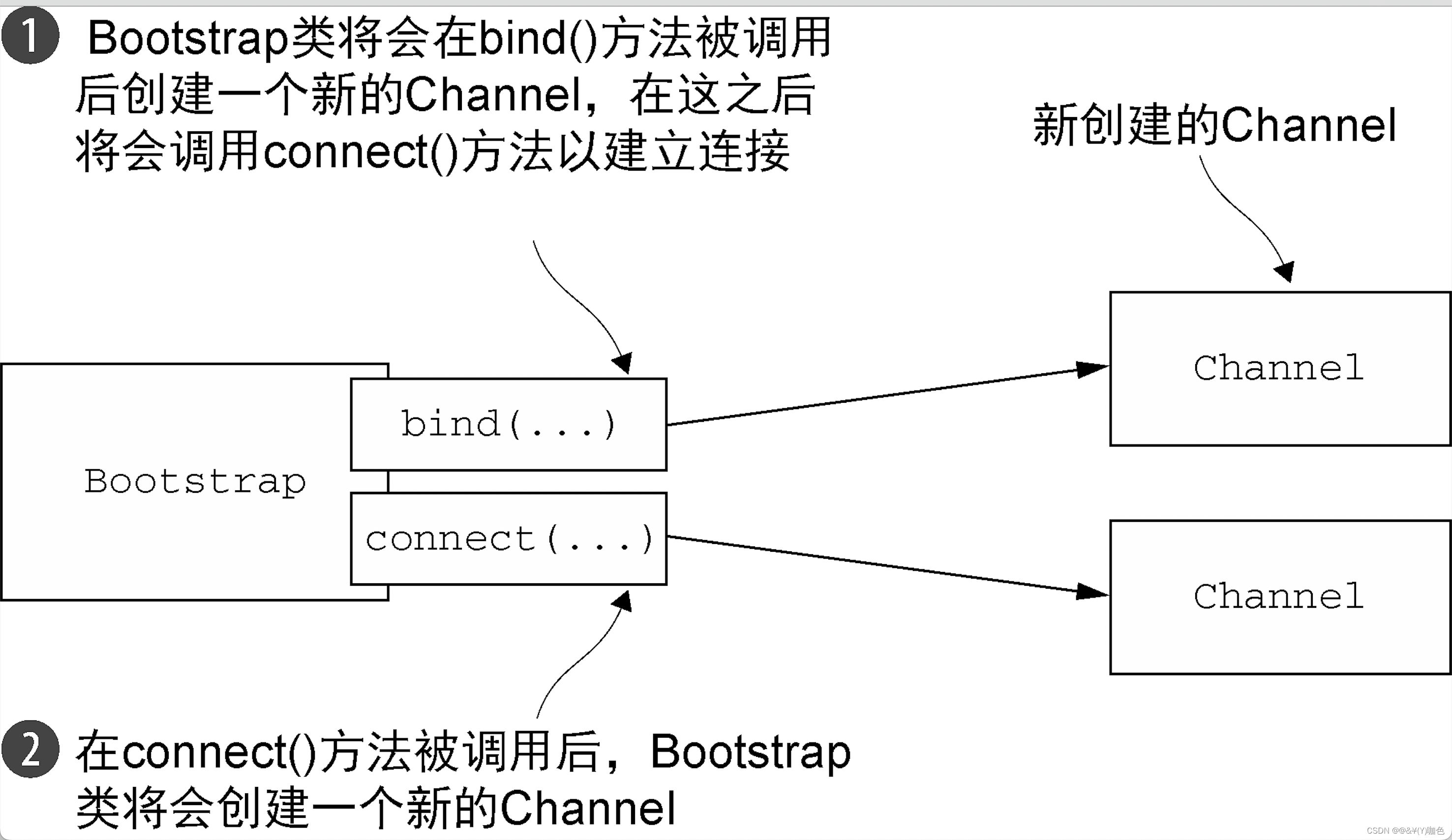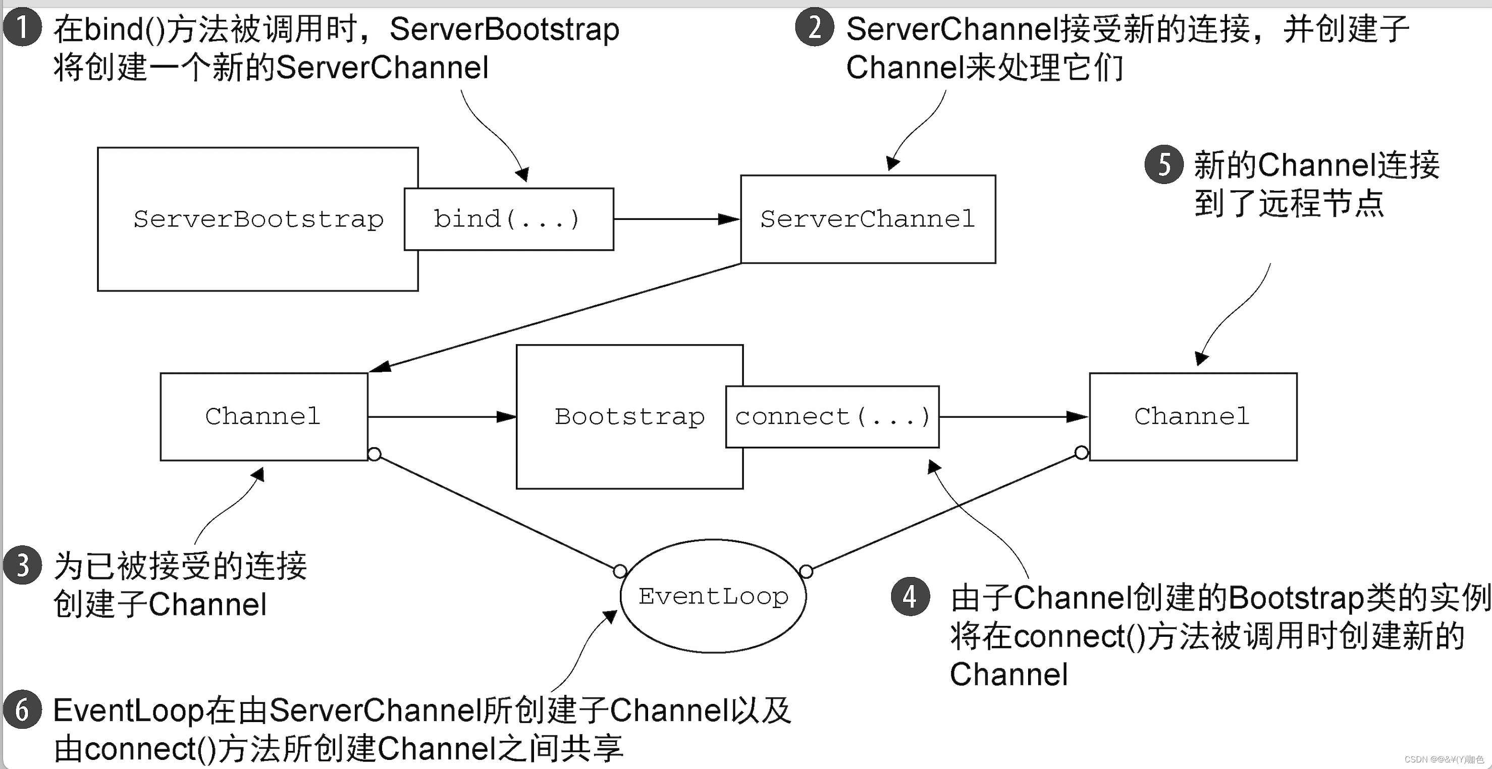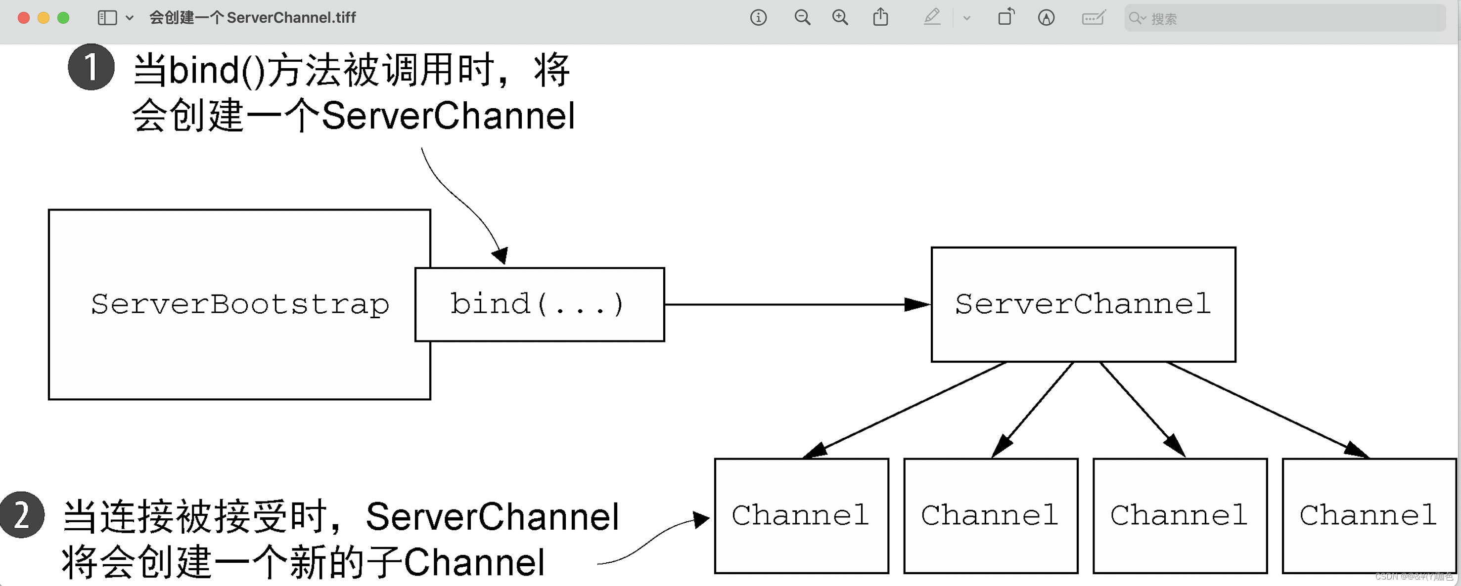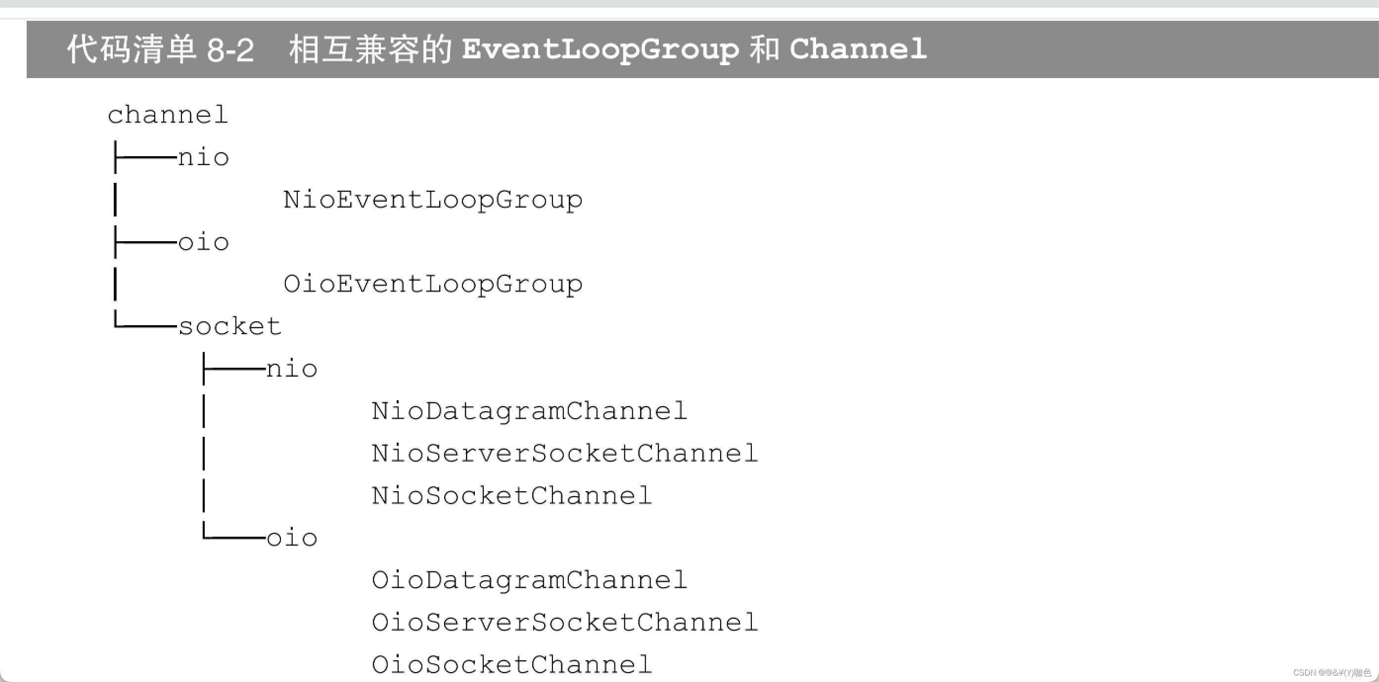 服务器需要两组不同的Channel,第一组只包含一个ServerChannel,代表服务器本身已绑定到本地端口正在监听到套接字,第二组将包含所有已创建的用来处理传入客户端的连接的Channel