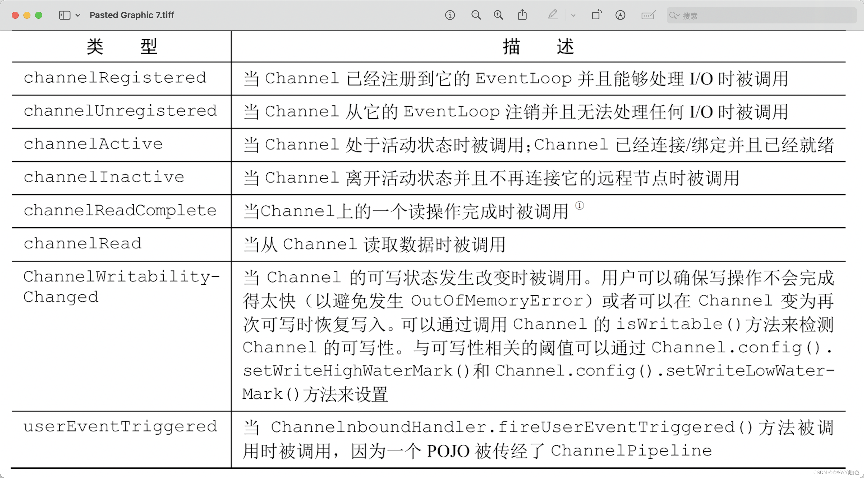 netty在内部使用了回调来处理事件,当一个回调被触发时,相关的事件可以被interface-ChannelHandler的实现处理