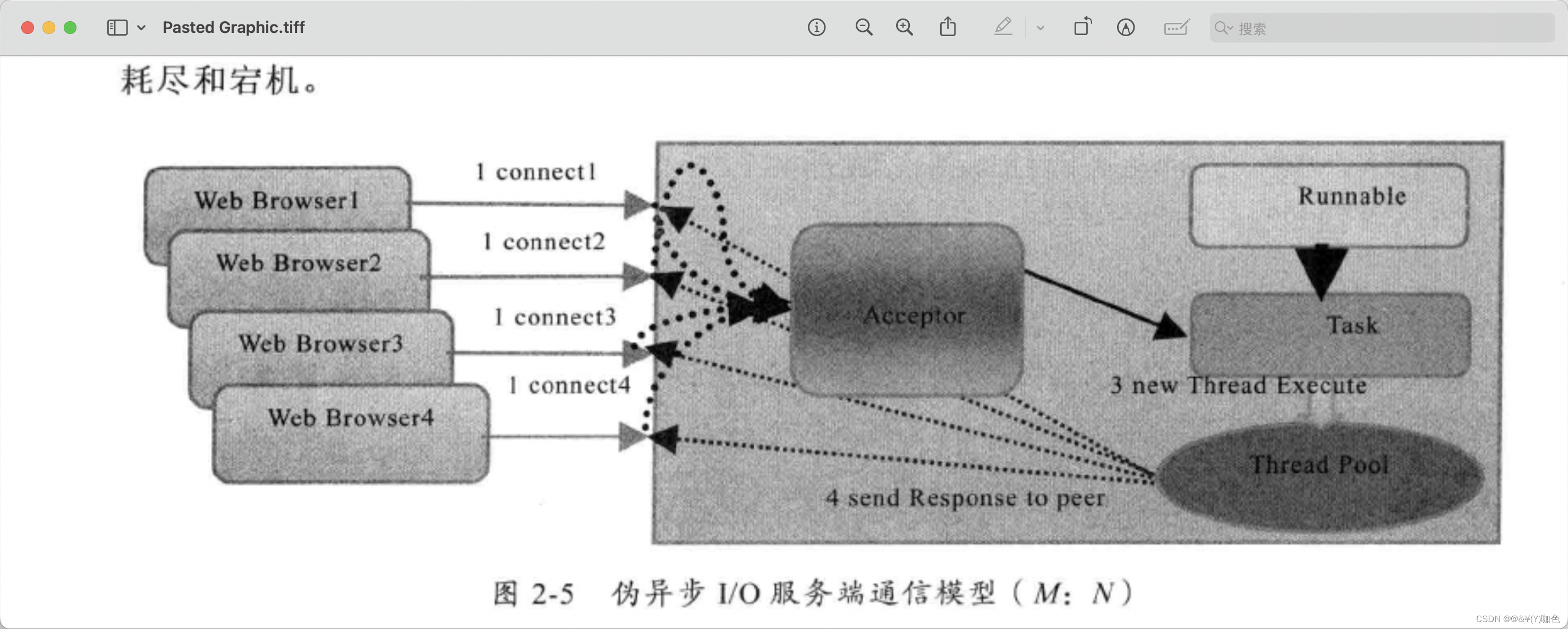 优点:将客户端的Socket包装成一个Task(该任务实现了Runnable接口)投递到后端的线程池中进行处理,由于线程池可以设置消息队列的大小和最大线程数,因此资源占用是可控的,无论多少个客户端并发访问,都不会导致资源的耗尽和宕机