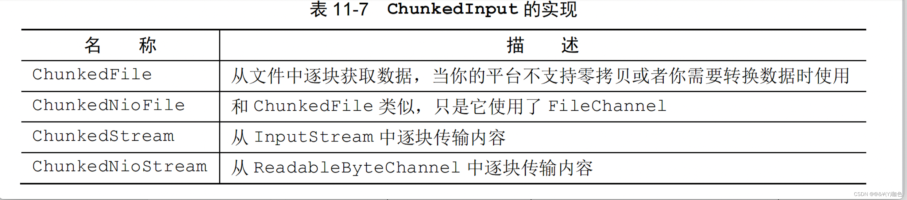- 需要将数据从文件系统复制到用户内存:使用ChunkedWriteHandler,它支持异步写大型数据流,而不会有大量的内存消耗 关键是Interface ChunkedInput<B> ,Netty预制了该接口的4个实现,每个都代表将由ChunkedWriteHandler处理的不定长度的数据流