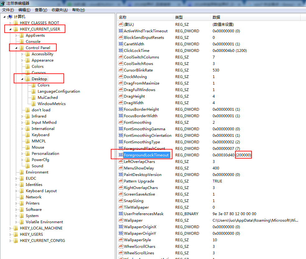 将HKEY_CURRENT_USER\Control Panel\Desktop中的ForegroundLockTimeout的选项,改成十进制的200000毫秒或者十六进制30d40。