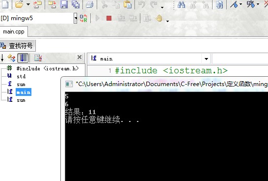 1 #include <iostream.h> 2 using namespace std; 3 int sum (int Num1,int Num2); //函数原型 函数声明 4 5 int main(int argc, char *argv[]) 6 { 7 int a,b,c; 8 cin >> a; 9 cin >> b; 10 c=sum(a,b); 11 cout << "结果:" << c << endl; 12 13 14 15 return 0; 16 } 17 18 int sum (int Num1,int Num2) //函数实现的过程 19 { 20 int MaxNum; 21 MaxNum=Num1+Num2; 22 return (MaxNum);//返回相加的和 (函数返回的值) 23 24 }