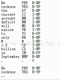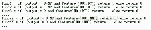 这几个函数我说明一下,%x[0,1]这个特征到前面的例子就是说,根据词语(第1列)的词性(第2列)来预测其标注(第3列),这些函数就是反应了训练样例的情况,func1反映了“训练样例中,词性是DT且标注是B-NP的情况”,func2反映了“训练样例中,词性是DT且标注是I-NP的情况”。
