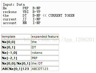 由上图可见,当前token是the这个单词。%x[-2,1]就就是the的前两行,1号列的元素(注意,列是从0号列开始的),即为PRP。