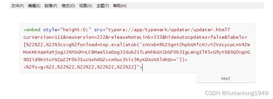 Typora-远程命令执行漏洞复现-CVE-2023-2317 Typora 是一款支持实时预览的 Markdown 文本编辑器。Windows和Linux版本存在一个安全漏洞,具体表现为在updater/update.html中存在DOM-based XSS漏洞。这个漏洞的危害是允许攻击者通过加载精心制作的markdown文件,来执行恶意的JavaScript代码。如果用户在Typora中打开了这个恶意markdown文件,或者从一个恶意网页复制文本并将其粘贴到Typora中,那么攻击者可以通过在<embed>标签中引用update.html来利用这个漏洞。