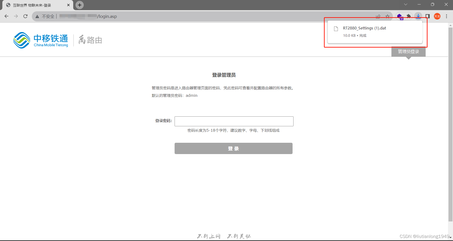 中国移动-禹路由-敏感信息泄露漏洞-CNVD-2020-67110 中国移动 禹路由 ExportSettings.sh 存在敏感信息泄露漏洞,攻击者通过漏洞获取配置文件,其中包含账号密码等敏感信息。title="互联世界 物联未来-登录"