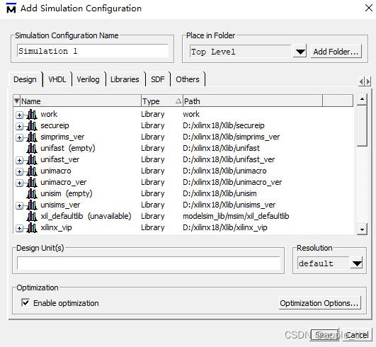这将打开“添加模拟配置”对话框。此对话框中的选项卡中显示了几个模拟选项。您可能想要探索这些选项卡看看有什么是可用的。您可以查阅ModelSim用户手册,以获得每个选项的描述。