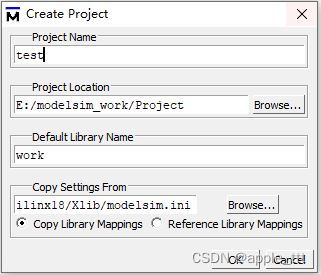 这将打开“创建项目”对话框,您可以在其中输入项目名称、项目位置(即目录)和默认库名称。您还可以从选定的.ini文件中引用库设置,或将它们直接复制到项目中。默认库是编译的设计单元所在的位置。