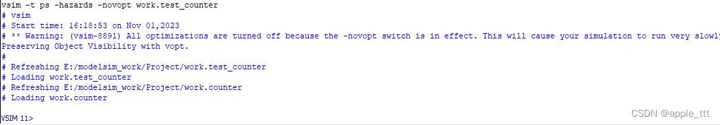 在主窗口的文字记录窗口中,vsim(ModelSim模拟器)调用显示了-hazards和-t ps开关。这些是在仿真对话框中指定的命令行选项。