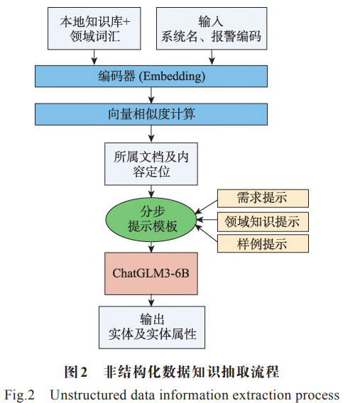 该流程以本地知识库为基础,通过向量匹配定位报警信息关联文档,最终实现关键实体属性抽取,具体步骤如下: