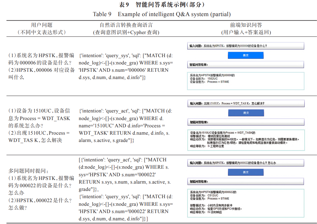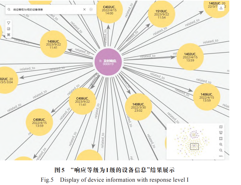 基于知识图谱的可视化智能问答。依托所构建的知识图谱,开展数据查询和可视化分析,采用大语言模型方法提取问题中关键实体信息; 利用 TF-IDF 特征提取器[26] 和朴素贝叶斯分类器[27] 明 确用户问题意图,基于知识图谱搜寻节点并将答案以自然语言形式返回至用户,完成报警响应对话问答。
