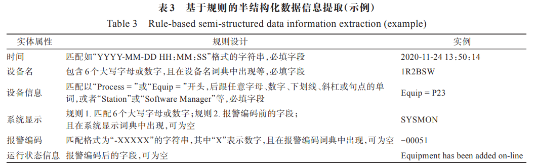 半结构化数据:如报警日志,采用正则表达式匹配、词典匹配、模板匹配等基于规则的方式,抽取实体及属性信息。