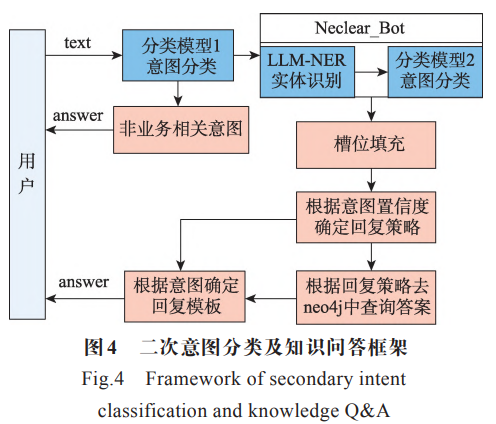 因用户问题输入表达相同语境的中文句式因人 而异,如何识别用户意图和问句中的实体信息是实 现基于图谱智能问答的关键点。本文通过设计二次意图分类模型,对用户的意图进行判断,如图4。