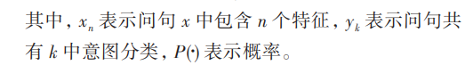 朴素贝叶斯被广泛用于文档分类中,它假设文 本的特征(单词、词组等)之间相互独立,然后基于训 练数据中的问句特征和问句意图分类标签计算每个 类别的条件概率,最后通过贝叶斯定理计算出用户 问句属于每个意图类别的概率,并选择概率最高的 类别作为预测结果,表示为: