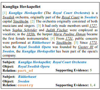 图1:来自DocRED的一个例子。DocRED中的每个文档都有命名实体提及、共同参考信息、句子内和句子间关系以及支持证据的注释。为本示例文档注释的19个关系实例中有2个被显示,这些实例中涉及的命名实体以蓝色表示,其他命名实体以下划线表示。注意,提到的相同主题(例如,Kungliga Hovkapellet和Royal Court Orchestra)在第一个关系实例中被识别出来。