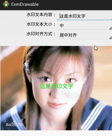 给图片添加水印文字,这也是一种常见的图片加工操作。通过自定义Drawable,可以不用修改原图片,直接在展示时添加水印文本,更方便更快捷。添加文本操作可调用Canvas类的drawText方法,至于文本颜色、文本大小等属性的设置,可通过Paint类来实现。比如设置文本颜色,调用的是Paint类的setColor;设置文本大小,调用的是Paint类的setTextSize;设置文本对齐方式,调用的是Paint类的setTextAlign。下面是自定义添加水印的Drawable效果图