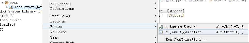 问题:Socket服务器端我将TestServer运行到Tomcat上面,这个没运行成功还需要什么配置吗?回答:TestServer.java不是以web方式启动的,要按下面步骤启动:右击TestServer.java,依次选择右键菜单“Run As”——“Java Application”。