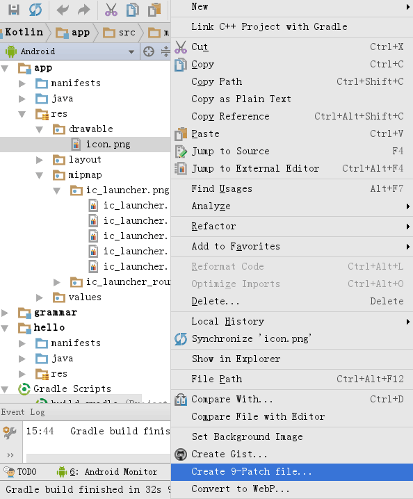 在android studio中选中drawable目录下的图片,然后右击在右键菜单中选择下面的“Create 9-Patch files”,在弹出的对话框中点击“OK”按钮。接着drawable目录就会出现一个名为“***.9.png”的图片文件,双击该文件,就可以在右侧窗口中编辑点九图片了。