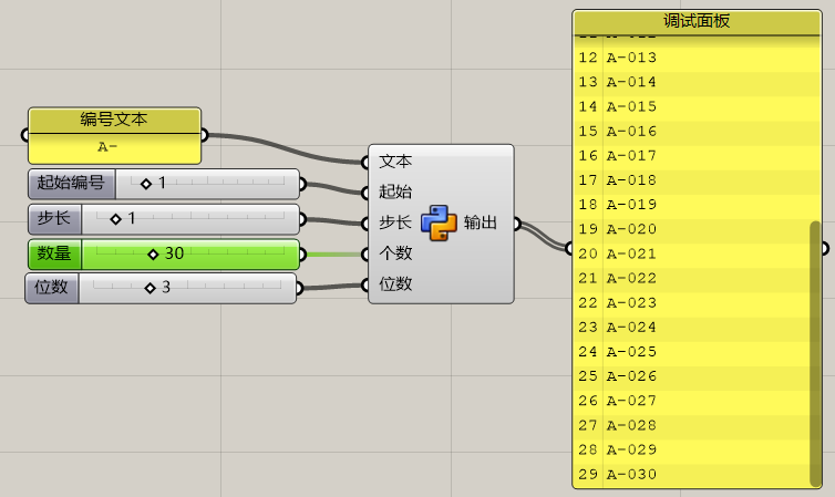 这3个原生电池是什么呢?因为我把GH给汉化了,在汉化版里,三个电池的名称分别是 调试面板,等差数列,连接文本。另外我还加了一个功能,就是自动补零。原生的电池是不能自动补零的,这个电池可以根据你要调整的位数进行自动补零,比如10位数,1前面就加0,变成01,百位数就是001,千位就是0001,依此类推,这样会显得稍微美观一点。