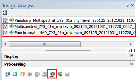 由于ZY-3 LEVEL 1级产品多光谱与全色传感器间存在轻度夹角,ArcGIS不提供ZY-3栅格产品的影像融合模板,可利用下述流程实现影像融合: