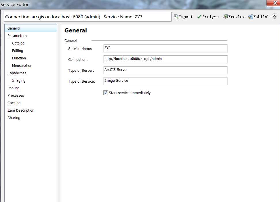 (4) 选择发布服务,设置服务名称,点击继续直至出现“Service Editor”页面。