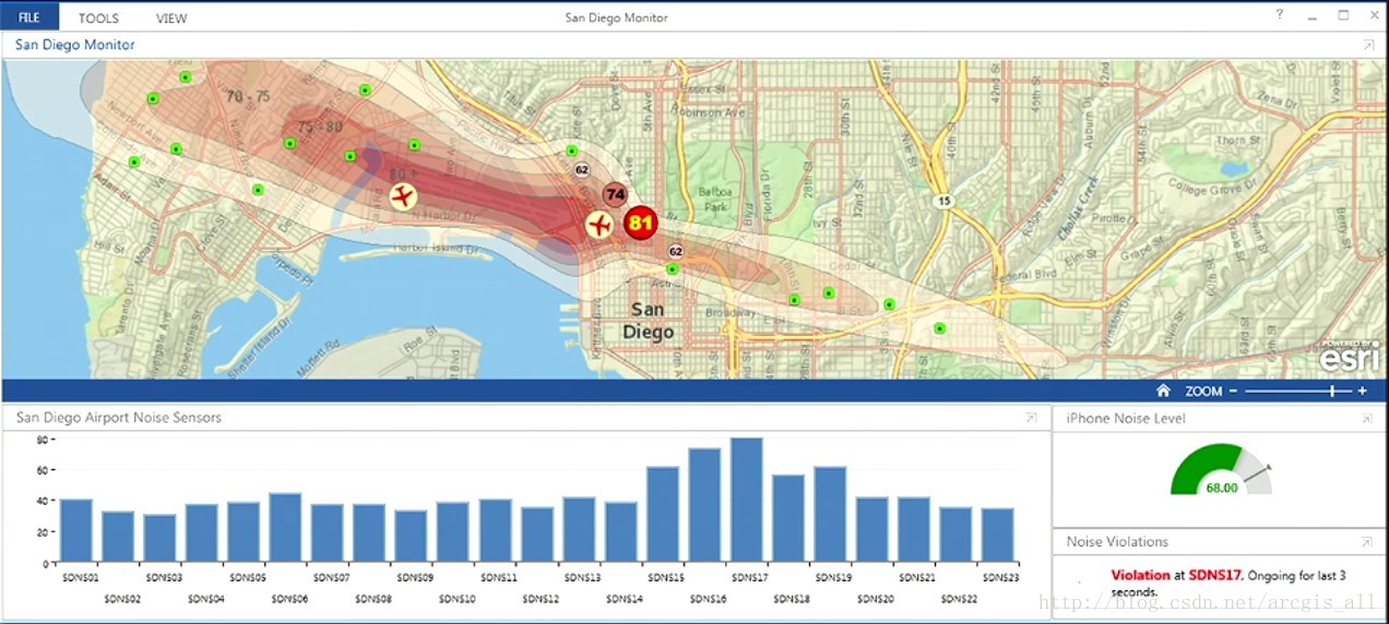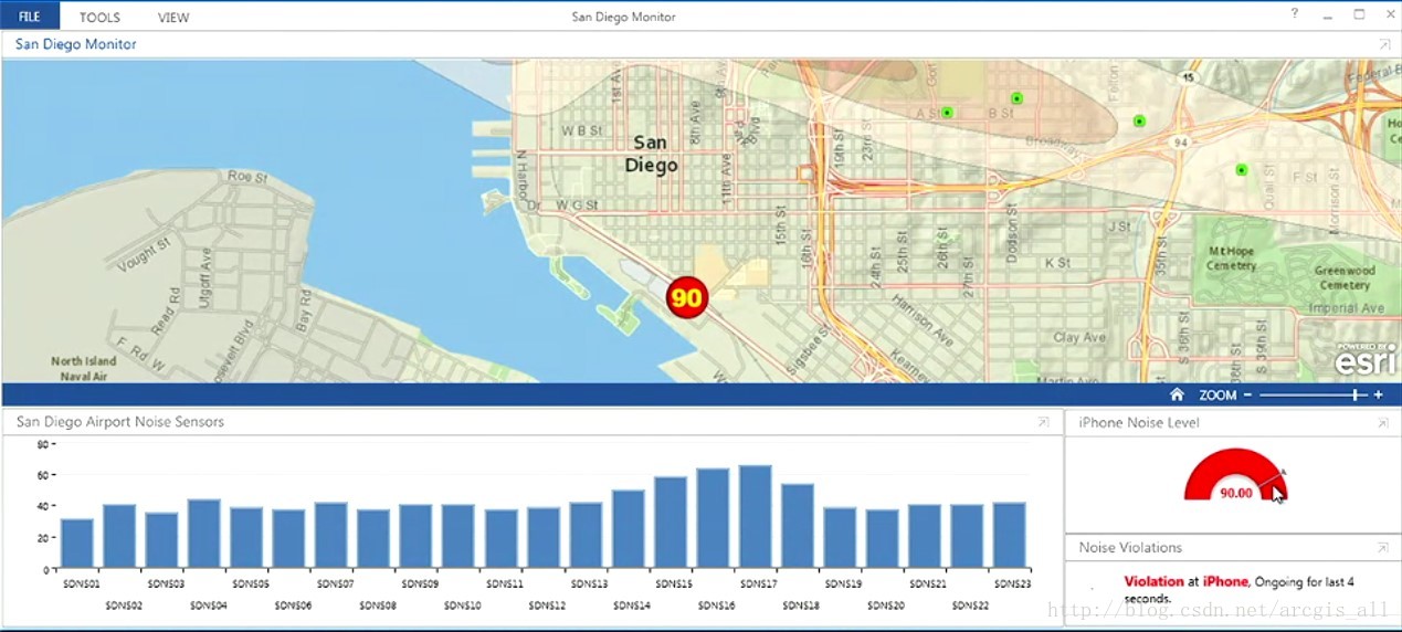 下面的Demo演示的是机场噪声监控。连接机场噪声传感器实时监控机场噪声污染。当噪声超过一定标准时进行提醒。