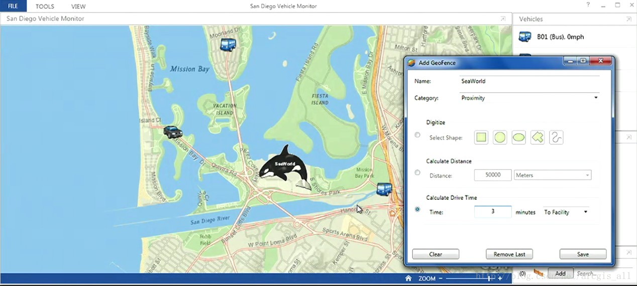 GeoEvent Processor可以创建地理围栏。这里创建海洋世界开车3分钟范围作为地理围栏,监控所有进入该范围的车辆。