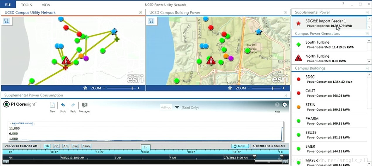GeoEvent Processor不仅可以监控车辆,还可以监控任何事物。它可以与OSIsoft的PI设备管理进行集成,用于监控大型企业设备的实时状态。如电力设施监控,实时监控电力设施,一旦发电设备出现故障,可立即看到。然后可以启用补充设备,还可以监控到其实时的用电量。