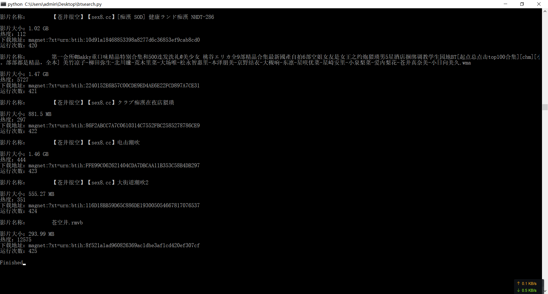 print('影片名称:'+i['title']+'\n'+'影片大小:'+i['size']+'\n'+'热度:'+i['hot']+'\n'+'下载地址:'+i['magnet']+'\n'+'运行次数:'+str(i['step'])+'\n')