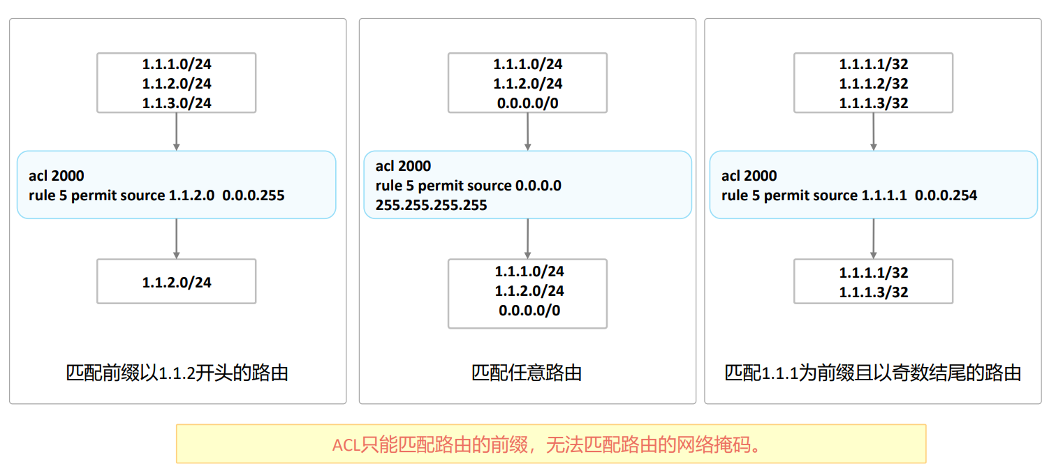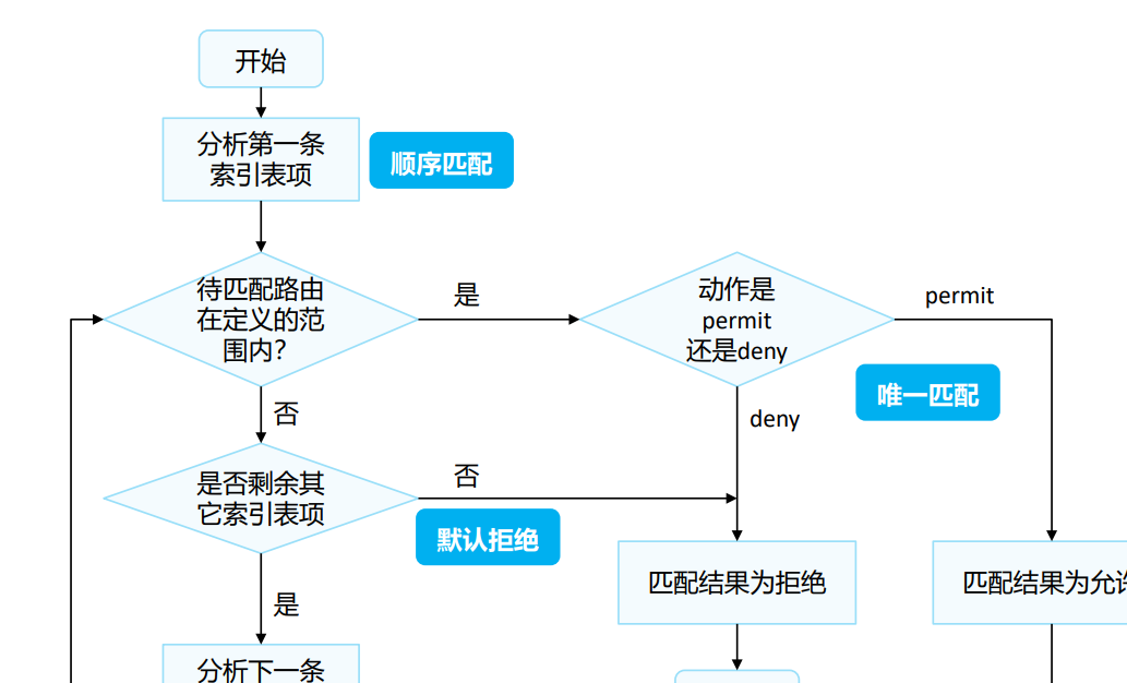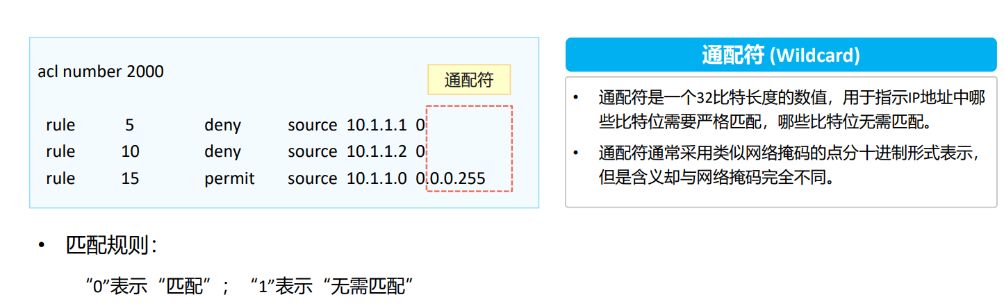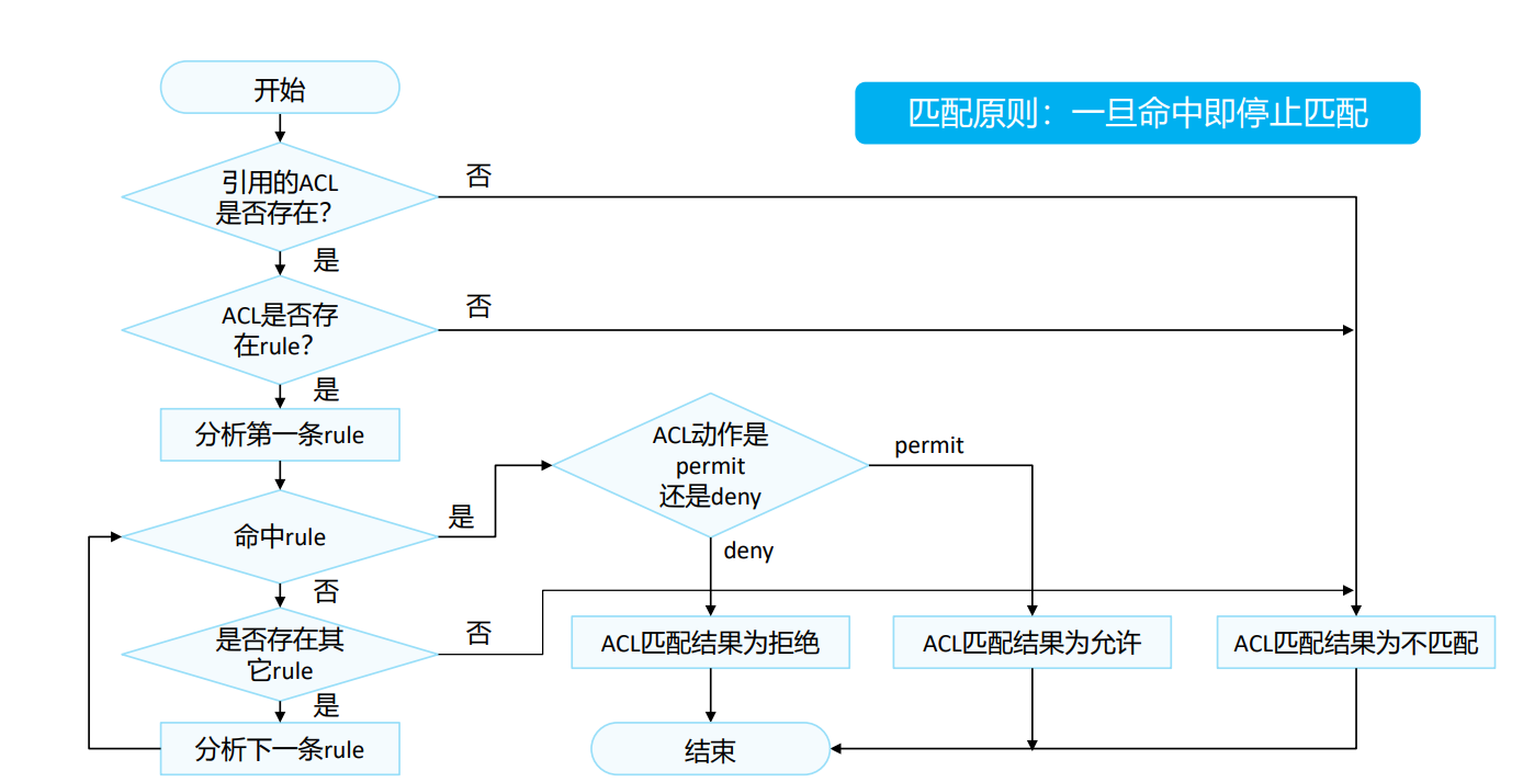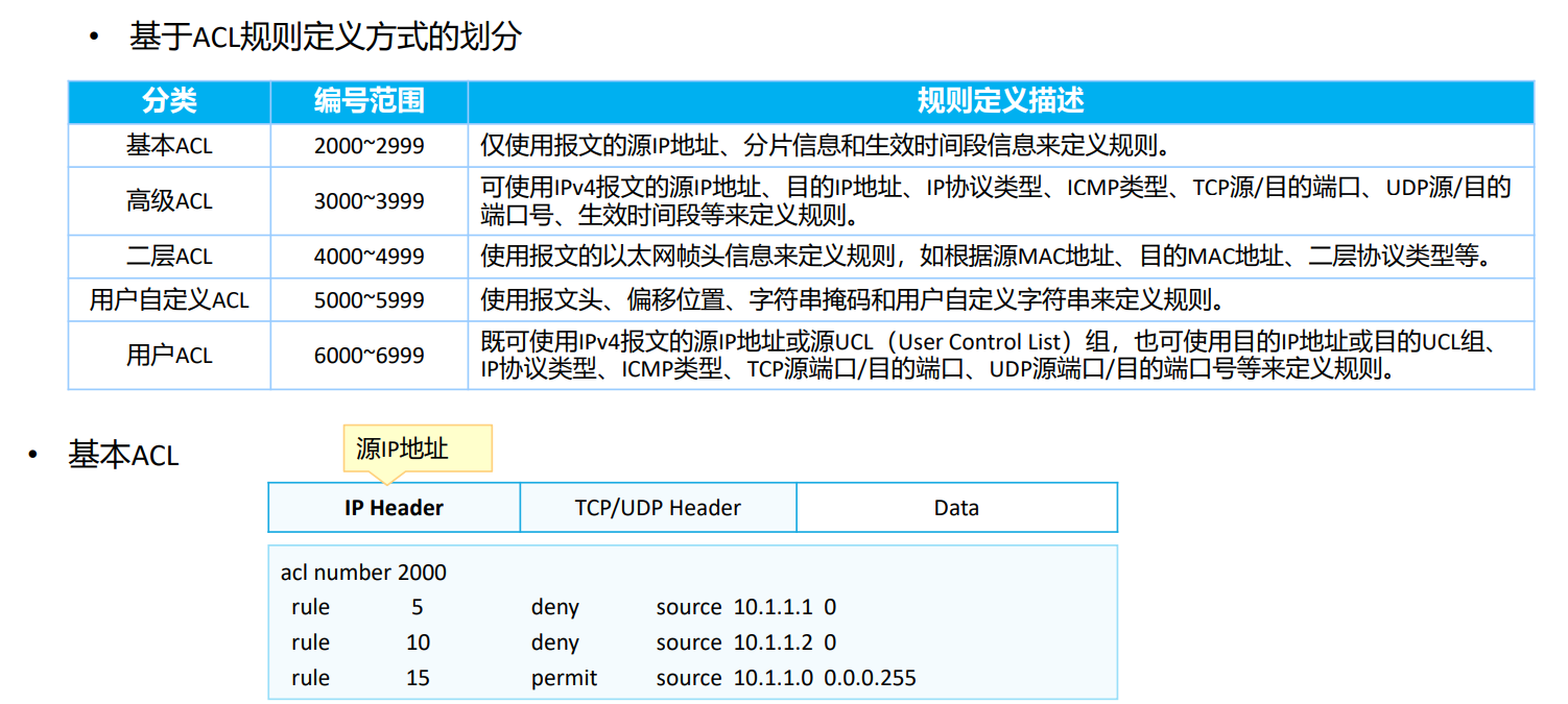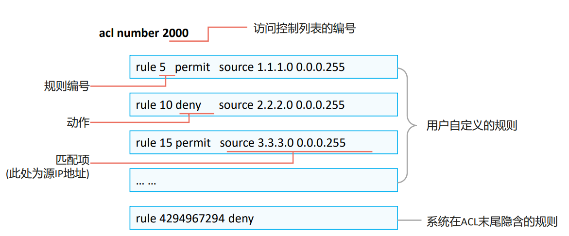 ACL由若干条permit或deny语句组成。每条语句就是该ACL的一条规则,每条语句中的permit或deny就是与这条规则相对应的处理动作。